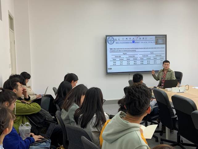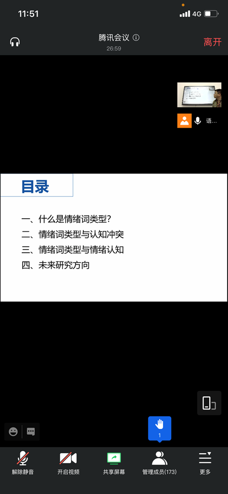 (汇报此次学术沙龙的主要内容和研讨摘要、说明项目的学术价值社会价值和此次沙龙的效果、提供出席此次沙龙的专家学者名单及相关新闻图片) 本次沙龙主要向学院老师介绍本项目的研究背景、研究问题和研究设计。参会老师表示出强烈的兴趣,也激发了很多相关老师的研究兴趣和跨学科合作的讨论,具体内容如下: 1. 项目简介 本项目旨在研究多个很少有人研究的外国语言(日语、德语和阿拉伯语)情绪词加工的神经机制。运用事件相关电位技术研究学习日语、德语和阿拉伯语的学习者在加工情绪词过程中的神经活动,以此来扩宽对情绪词加工的理解。 2. 沙龙主要内容及讨论摘要 本次沙龙是采用的线上线下混合式呈现,上线共有170余人参加,具体内容如下: (1)首先介绍情绪词的定义,从情绪词类型的角度对情绪词的界定加入了新的视角。 (2)介绍前期的研究积累,包括情绪词类型在不同的研究范式中的行为表现、神经活动等方面的作用。特别是情绪词类型视角对于认知冲突加工和情绪加工过程的影响的一系列研究做了详细介绍。 (3)谈论研究项目的作为情绪词研究的新的发展方向,特别是不同的语言中的情绪词加工过程可以借鉴前人研究进一步得到探讨。 3参会的专家学者包括: 蒋晓明老师,谭滢滢老师,张文硕老师,廖巧云老师,林皓老师。