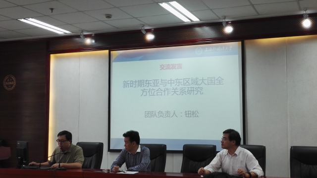 英语学院陈琦老师和中东研究所钮松老师作为上海外国语大学第二批青年教师科研创新团队的代表进行了发言。他们汇报了所属团队自启动以来取得的主要建设成果,并对团队建设的核心理念、心得体会、发展规划等进行了较为详尽的阐述。