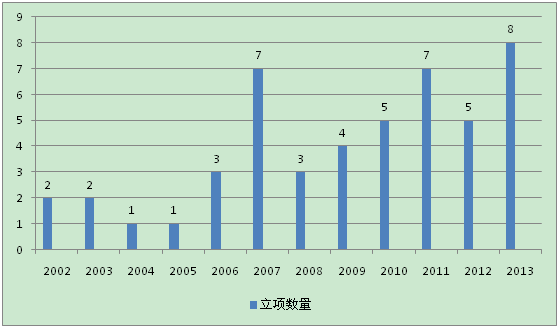 从立项数量看,2013年我校获准立项数量为历年之最。我校2002-2013年国家社科基金项目立项数量如下:
