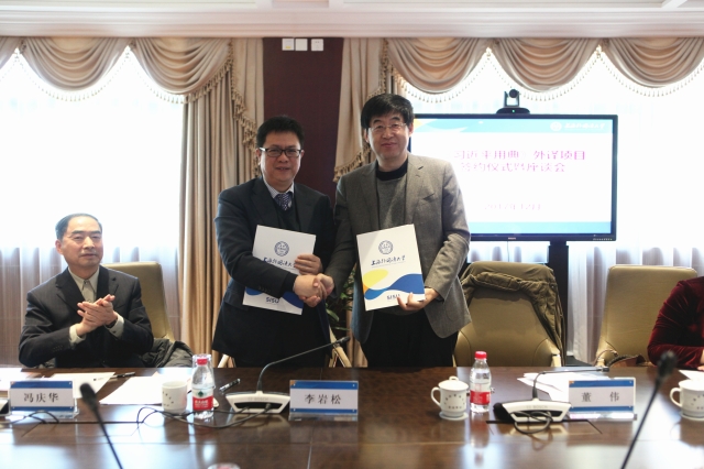 2017年12月8日,《习近平用典》外译项目签约仪式暨座谈会在上海外国语大学国际会议中心莱茵厅隆重举行。上海外国语大学与人民日报出版社正式建立合作关系,共同推进《习近平用典》一书英语、俄语、法语、西班牙语、德语、日语和葡萄牙语七种文版的外译出版工作。人民日报社董伟社长、上海外国语大学李岩松校长、冯庆华副校长莅临签约仪式。人民日报出版社第一编辑中心曹腾主任、国际交流中心袁兆英主任、上外科研处王有勇处长、毛文伟副处长以及李维屏、宋炳辉、钱培鑫等10余名专家学者共同出席本次活动。