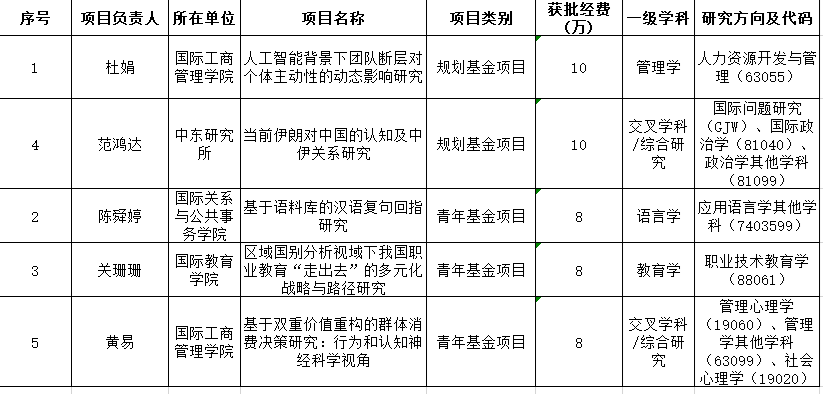 近日,教育部社科司公布2022年度教育部人文社会科学研究一般项目立项名单。我校共有5项课题获准立项。其中,规划基金项目2项,青年基金项目3项,包括交叉学科/综合研究(2项)、语言学(1项)、教育学(1项)。具体项目清单如下: