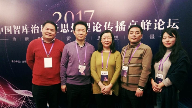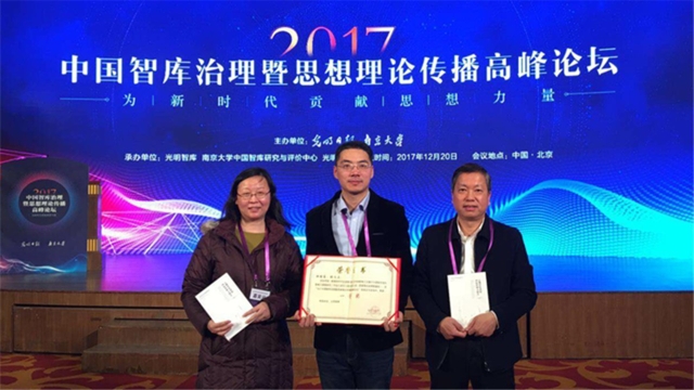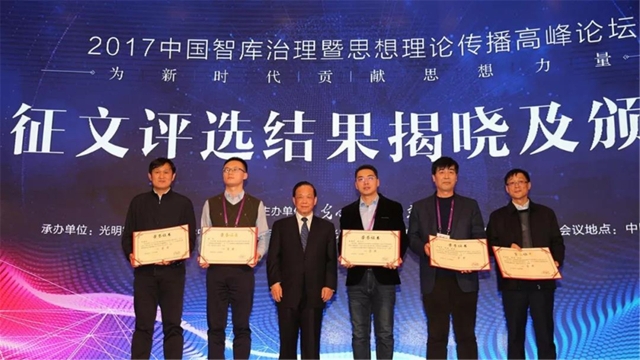 作为“2017中国智库治理暨思想理论传播高峰论坛”的重要组成部分,光明日报社组织了以“为新时代贡献思想力量”为主题的有奖征文活动。经专家评审,我校相德宝、张文正合作撰写的“新媒体时代全球智库社交网络影响力及提升中国智库国际影响力策略研究”荣获“智库建设类”征文一等奖。